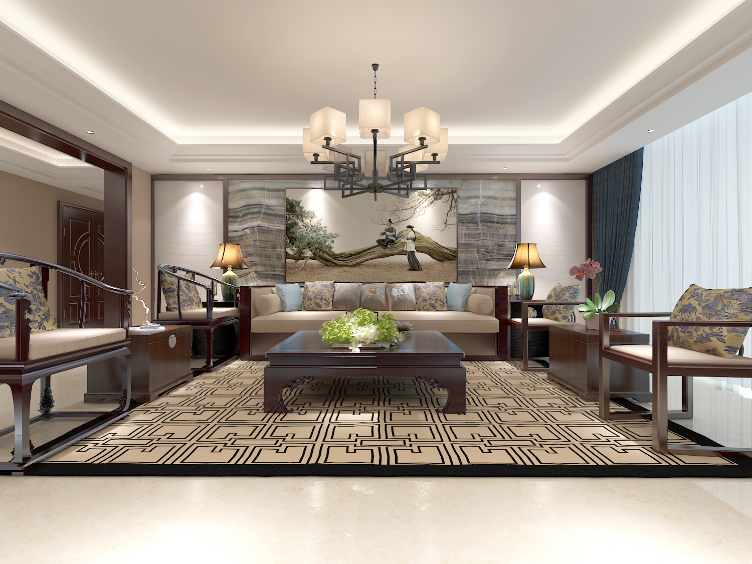 本案中的360平米的三居室整體采用了新中式風格裝修,新中式風格的設計不拘泥于傳統的中式元素,而是在繼承古典的基礎上融入現代的特色,將兩者有機地統一起來,作品表達出現代人對于中式風格低調沉穩的精神境界的追求。