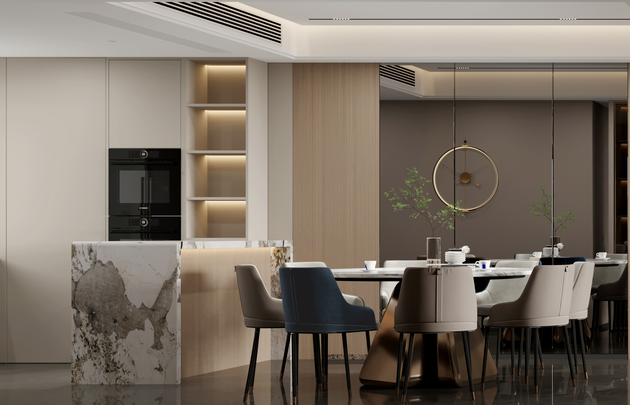 著重用空間處理的設(shè)計手法,來強調(diào)空間的靈活分割,以追求設(shè)計的幾何性和秩序感,空間線條簡約、流暢。